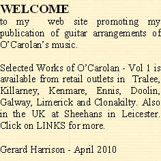 As promised last year, I hope to provide, each month, a live recording of one of the tunes in the book. This month I present Blind Mary. This wonderful melody is the one that initiated my interest in O’Carolan many years ago. You are welcome to download it and play it whenever you wish: The only thing I ask is that you state where it came from. Just click on the loudspeaker logo to hear the music. I hope you enjoy it. If you are experiencing some distortion, right click the logo and select “Save Target As” to download the music file. |